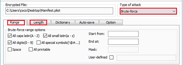 如果选择暴力攻击,设置密码范围和长度以缩短恢复时间。