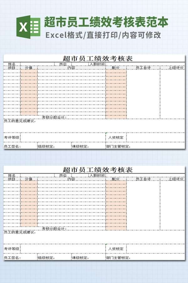 超市员工绩效考核表示范是对超市员工工作进行评估和统计的示范模板。超市员工绩效考核表示范本为PC为您提供免费下载,源文件为Excel格式模板,您可以直接下载源文件,以便修改内容,您可以免费下载。