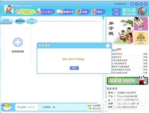 1、点击首页【添加新课程】,弹出平台信息“请插入要学习的课程盘!”;