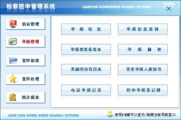 举报管理(举报信息、举报信息查询、举报要案备案表、举报摘要、奖励有功有员表、答复举报人通知书、电话举报记录、控申举报登记薄);