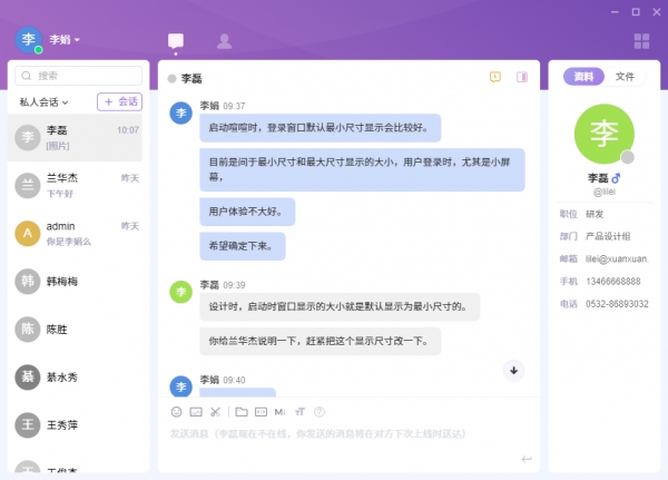 喧喧是由然之协同团队推出的一款轻量级的开源企业聊天软件,属于开源软件,喧喧是一个已经实现基础功能的,跨平台的,轻量级的,非常容易进行二次开发的开源聊天解决方案,需要部署服务器才可以使用,服务器内置在然之协同里,连接到服务器后,您就可以和其他连接到服务器的同事进行沟通。