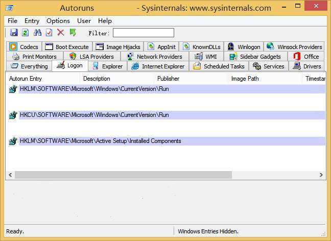 Autoruns,专业启动项管理软件,强悍的启动管理工具,非常着名的自启动项目管理工具。Autoruns由微软旗下的Sysinternals公司出品,作者为Mark Russinovich 和 Bryce Cogswell,这款工具小巧免费,原生单执行文件,利用它可以查看管理包含任何启动监视软件的自动启动位置的全面信息。它即能显示 Windows 启动或登录时自动运行的程序,并允许用户有选择地禁用或删除它们,例如,那些在“启动”文件夹和注册表相关“键”中的程序。此外它还可以管理包括:Windows 资源管理器 Shell 扩展(如右键弹出菜单)、IE 浏览器插件(如工具栏扩展)、系统服务和驱动、计划任务、镜像挟持等多种不同的自启动程序。autoruns可以修改系统服务、驱动程序,编辑引导执行程序,控制用户账户,配置IE浏览器,还能关联解码组件,功能非常强大,Autoruns 不仅可以对各启动项目进行管理,还能直接修改注册表文件。