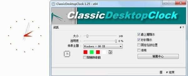 ClassicDesktopClock绿色免费版是一款非常经典的桌面时钟,可以自定义颜色,主题,位置,大小,透明度等等,能够帮您轻松装饰的自己的桌面,并且软件支持在您的电脑桌面显示当地时间,感兴趣的快来下载吧。
