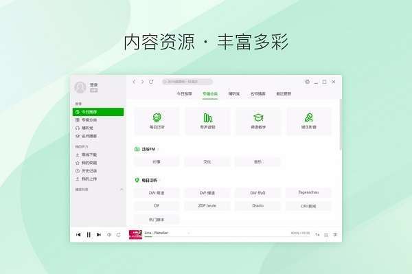 每天推荐最新最热的德语资源, 每周由编辑为您挑选德语阅读资源。 此外,软件还在专辑分类中提供了丰富的频道,任您订阅。