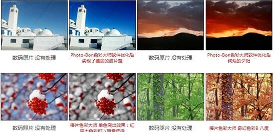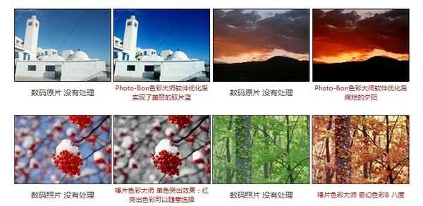 “Photo-Bon棒片色彩大师”的最亮点就是其提供的16种完美的数码照片优化效果,能够满足几乎所有数码照片色彩优化处理的需求。例如:鲜艳胶片效果、超极艳丽色彩、柔光效果、怀旧色彩效果、忧伤色彩效果,奇幻色彩(A到C),单色突出效果(可以随意选择突出的颜色)……。举例说,其中专业反转摄影胶片的模拟效果,是通过分析上千幅摄影大师作品的色彩特点得出的色彩模型,使所处理的数码照片客观上更接近真实的“专业反转摄影胶片”效果。