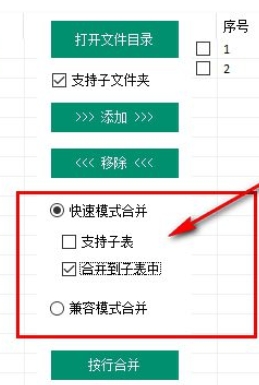 4、这里有快速合并,支持子表、合并到子表中、兼容模式合并,如果没有错误,就点击“按行合并”