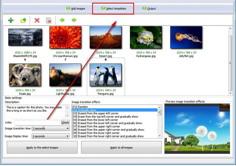 Boxoft Flash Slideshow Creator使您可以在多种过渡效果之间进行选择。这些通过模板进行分组,例如生日,儿童,古典,地球,田野,舞台,冬天和房间。