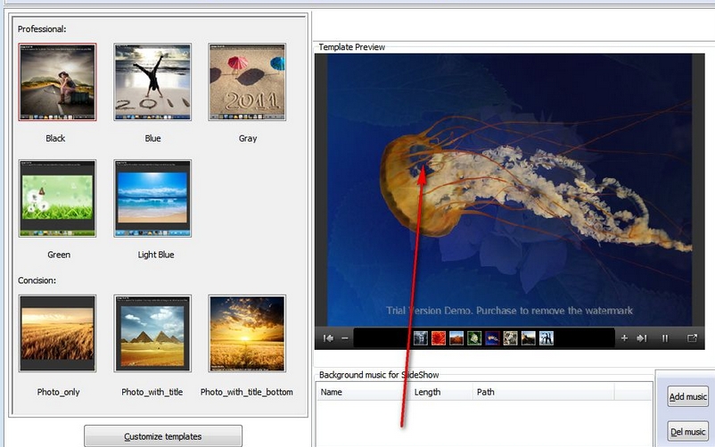 此外,您可以设置模板的大小,在幻灯片放映中显示控制按钮,以跳转到下一张或上一张图片,暂停幻灯片放映,并静音,以及添加背景音乐(MP3,WAV,WMA)循环选项和淡入/淡出效果。