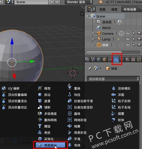 2、点击blender中文版右边属性导航选择“修改”,给球体添加“表面细分”修改器,如图所示:
