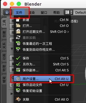 4、点击blender中文版菜单中“文件”--“用户设置”。