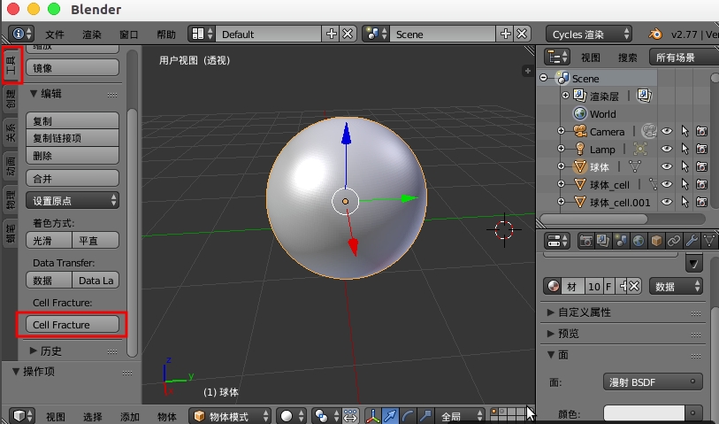 6、选择“球体”,选择blender中文版左侧的“工具”中点击“Cell Fracture”。