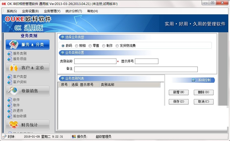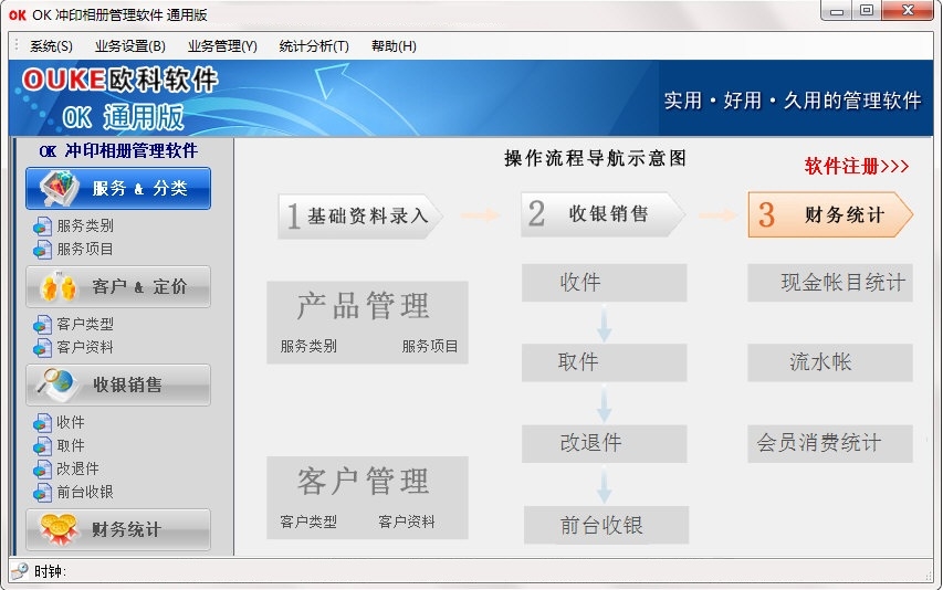 OK冲印相册管理软件最新版是款功能十分出众的照相馆管理工具,OK冲印相册管理软件最新版是为了从事照相馆冲印照片进行量身打造的,OK冲印相册管理软件支持会员管理、收取退件、采购、物流、快递、财务等多功能,一定程度上,满足用户的需要。