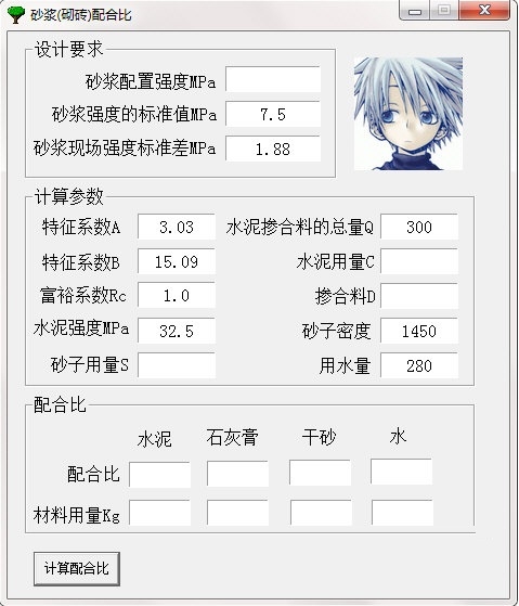 目前常用的砌筑砂浆有水泥砂浆和水泥混合砂浆两大类。根据《砌筑砂浆配合比设计规程》规定,砌砖砂浆配合比设计过程:确定试配强度、计算水泥用量、水泥混合砂浆的掺加料用量、确定砂子和水用量。进行初步配合比设计后,必须对该配比进行的试配、调整与确定。补充:例如:M7.5水泥沙浆 325#水泥 244Kg/m3 中砂 1602.97Kg/m3 水745.76Kg/m3