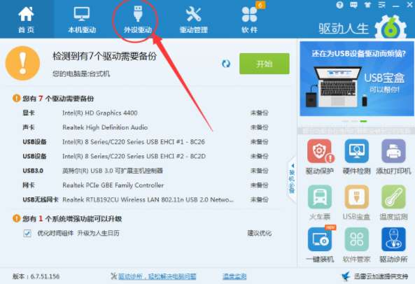 1) 打开电脑中的驱动人生,然后在其界面顶部的功能列表当中打开“外设驱动”