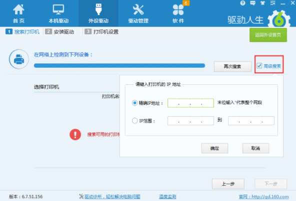 4)也有部分用户可能会卡在第二步,搜索可用的打印机驱动失败,这个时候我们只需勾选上“高级搜素”,并输入精确的打印机IP地址或IP范围,接着点击确定后驱动人生会自动搜索打印机了