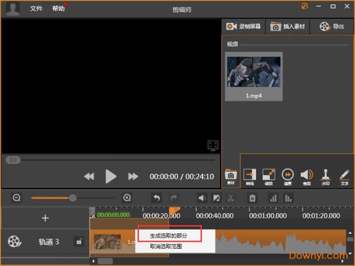 4、接着在素材区的进度条中拖动两个黄色按钮来选中想要截取的片段,选取完毕后在该片段中点击鼠标右键,之后在弹出的选项中点击“生成选取的部分”;