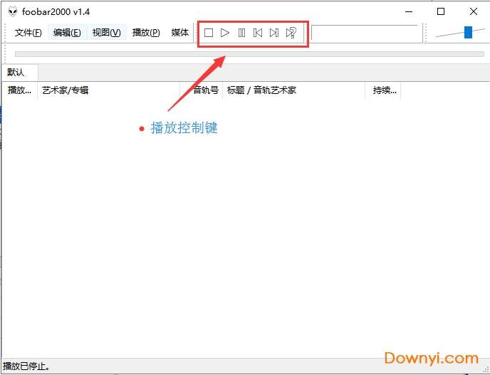 3、将音乐文件添加到软件后,我们就可以开始播放音乐文件了,在界面上方有音乐播放的功能键,依次为播放/停止、播放、暂停、上一首、下一首、随机播放选项,我们可以根据自己的需要来选择。