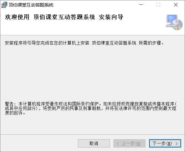 1、在PC下载网下载顶伯课堂互动答题系统最新版压缩包,然后进行解压,解压之后得到exe程序,双击该程序,点击下一步