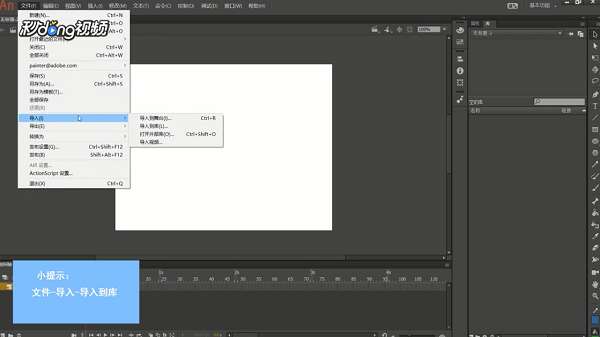 1、首先打开animate,点击上方的文件选项,选择“导入”,再继续选择“导入到库”,选择一个音频文件到舞台。
