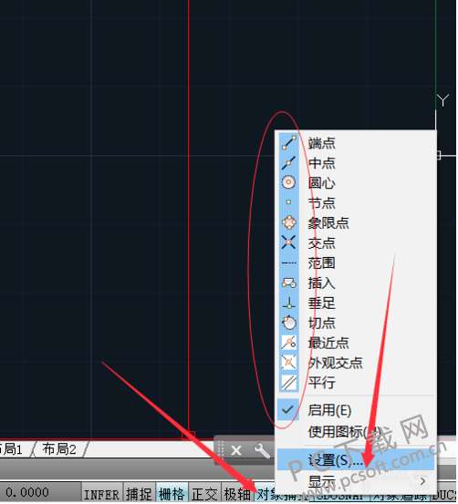 2、然后点击底部状态栏的“对象捕捉”,在弹出的选项中点击“设置”选项。