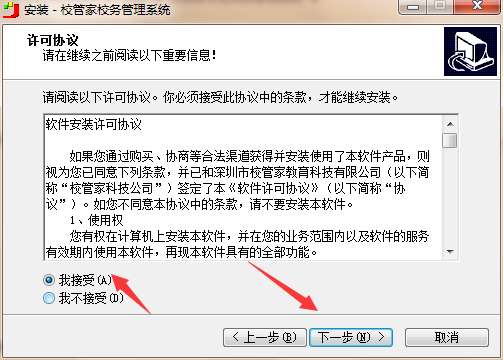 2、查看协议,选择我接受,然后点击下一步