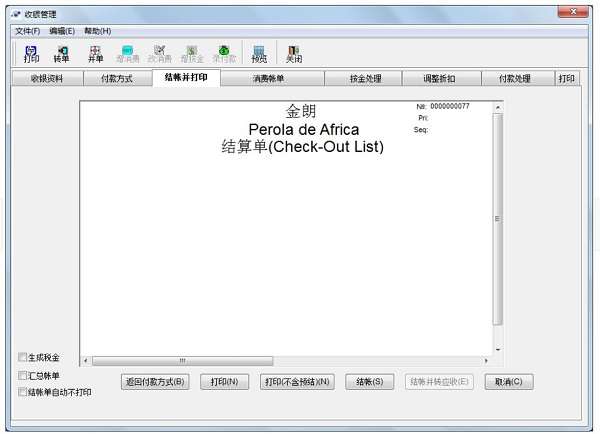 3、 部分结账及结帐退房,打印明细账、汇总账及混合账单