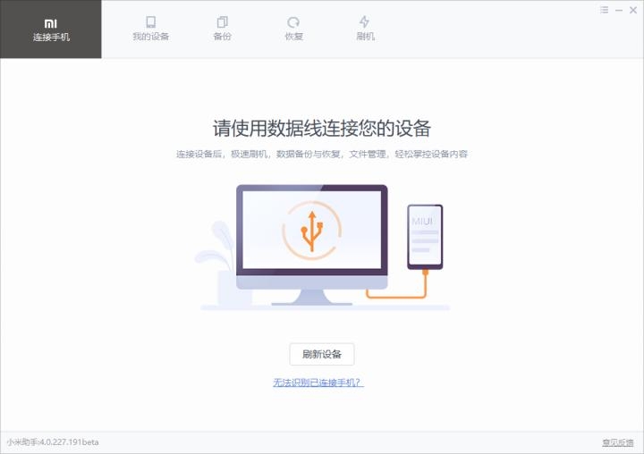 小米助手是为满足用户在PC端管理小米手机的需求而开发的工具类软件,主要提供数据备份、恢复功能,刷机功能,