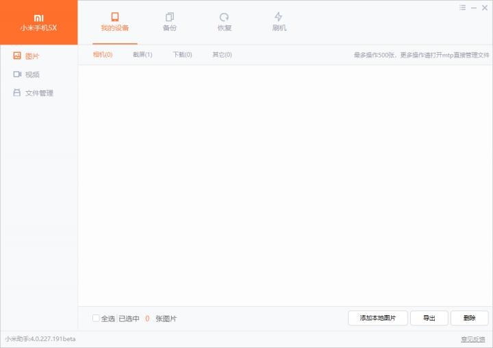小米助手3.0 二期beta版立足于实现PC端的小米手机管理功能,除了备份、恢复以外,新增了图片、视频、文件的本地添加、导出和删除功能
