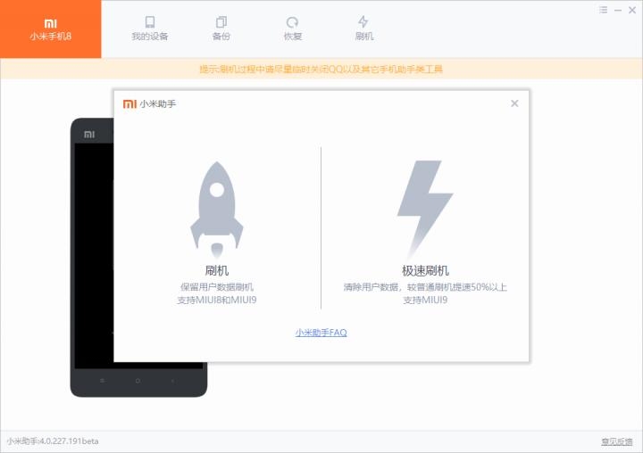 (2) 极速刷机需要底包为MIUI9 及以上,极速刷机为清数据刷机;