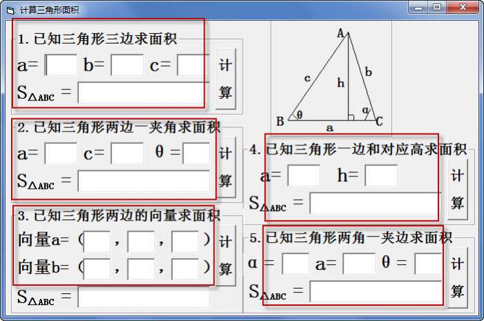 输入三角形三边长度(a、b、c)然后点击“计算”,三角型面积将自动显示在“S”后面的方框中。——用法就是这么简单!