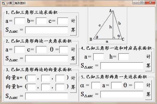 这款三角形面积计算器可根据三角形面积计算公式S=1/2ah去计算,解决您三角形面积不会计算的困难!
