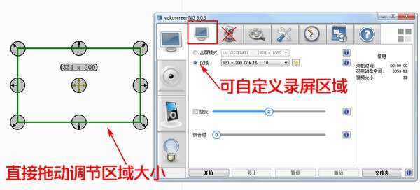 屏幕录制设置:可以选择全屏模式,或者区域模式模式,也可以自定义设置屏幕大小,支持自行拖动调节大小