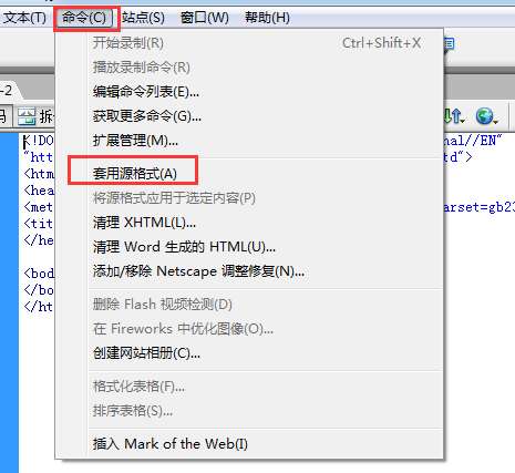 1、如果您在编辑代码是遇到格式乱了,您可以点击dreamweaver8菜单栏中的【命令】在弹出的选项中点击【套用源格式】就可以把代码格式化。