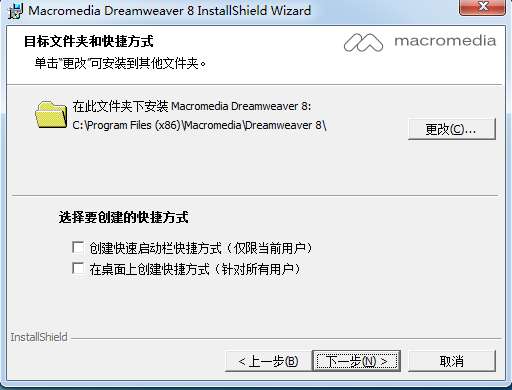 3、选择Dreamweaver8安装位置,您可以点击【更改】在打开的窗口中,您可以自行选择软件安装位置,选择完成后,您可以自行选择是否创建快捷方式,选择完成后点击【下一步】继续安装。