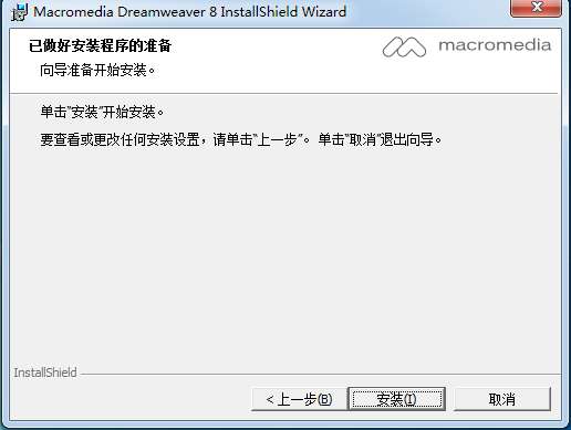 5、准备安装Dreamweaver8,你可以点击【安装】软件开始安装,如果您要更改软件安装设置,点击【上一步】进行修改。