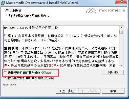 2、进入Dreamweaver8安装协议界面,您可以先阅读协议中的内容,阅读完成后点击【我接受】然后点击【下一步】继续安装。