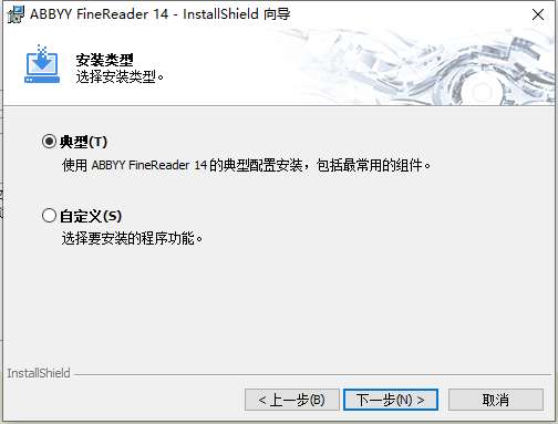 3、选择ABBYY FineReader安装类型,典型:安装ABBYY FineReader14的常用组件,自定义:您可以自行选择安装程序,小编选择的是【自定义】,您可以自行选择。