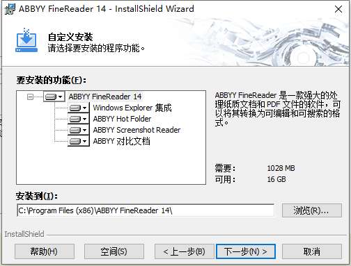 4、进入ABBYY FineReader自定义安装界面,您可以选择软件安装功能,选择完成后点击【浏览】在打开的窗口中您可以自行选择ABBYY FineReader安装位置,选择完成后点击【下一步】。