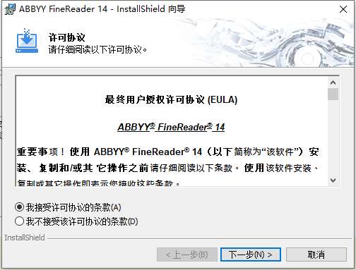 2、进入ABBYY FineReader安装协议界面,您可以先阅读协议中的内容,阅读完成后点击【我接受】然后点击【下一步】。