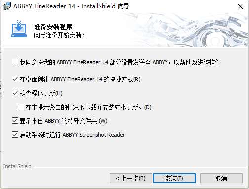 5、准备安装ABBYY FineReader,您可以自行勾选您需要的选项,选择完成后点击【安装】就可以了。