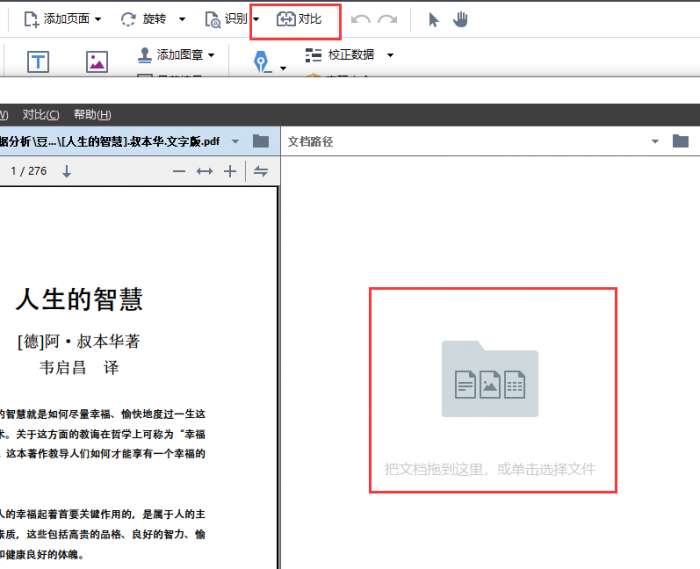 4、您可以使用ABBYY FineReader对比功能,查看修改前的对比。点击工具栏中的【对比】在打开的对比窗口中添加您要对比的文件。