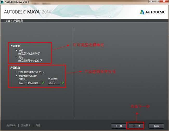 这个页面中许可类型部分我们点击“单机许可”,