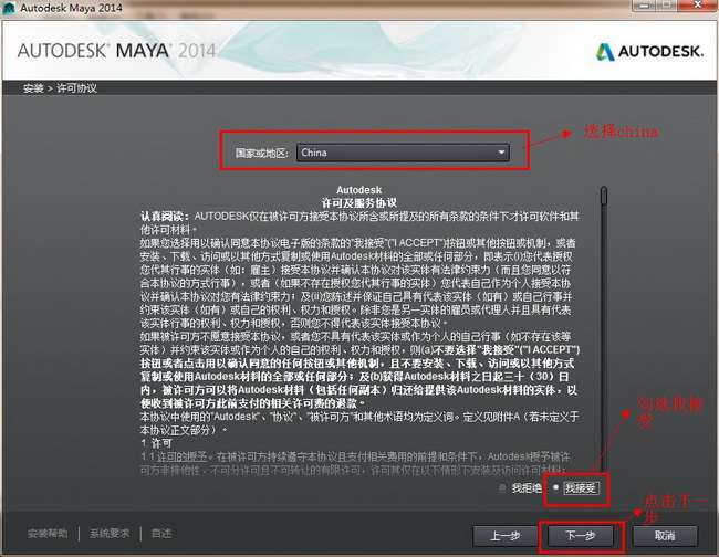 这里国家或地域选择“china”,选择“我接受”,点击下一步。