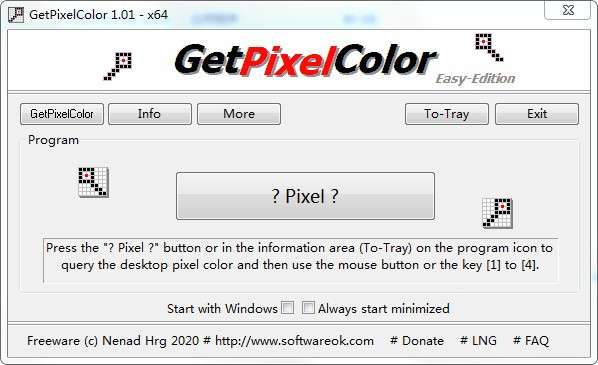 该程序适用于没有经验的视窗电脑用户和有经验的平面设计师。这个功能也可以用更复杂的程序来实现。但不是每个人都可以在个人电脑上进行各种设置来实现简单但有用的功能。即使作为一个电脑初学者,你也可以使用这个免费程序来确定正确的像素颜色。直接从程序或窗口任务栏的通知区域使用鼠标。