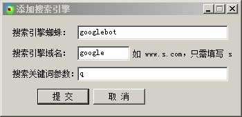 2)分别输入“搜索引擎蜘蛛、搜索引擎域名和搜索关键词参数”,最后提交即可。