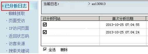 1、单击“已分析日志”,如果已经分析了两个以上的网站,会显示它们的域名,单击“全选”选中它们,如图5所示: