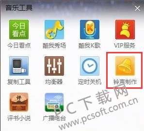 3、进入音乐工具界面后,可以看到有今日看点、酷我秀场、酷我K歌、VIP服务、广播电台等多种选项,我们找到铃声制作点击打开。
