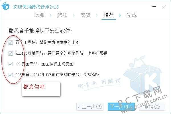4、酷我音乐2013安装进度条完成后,进入推荐界面,酷我音乐会推荐用户安装其他软件,用户可以看下方推荐的软件是否需要,如果不需要将他们前面选框中的勾选去掉,然后再点击右下角的下一步按钮。