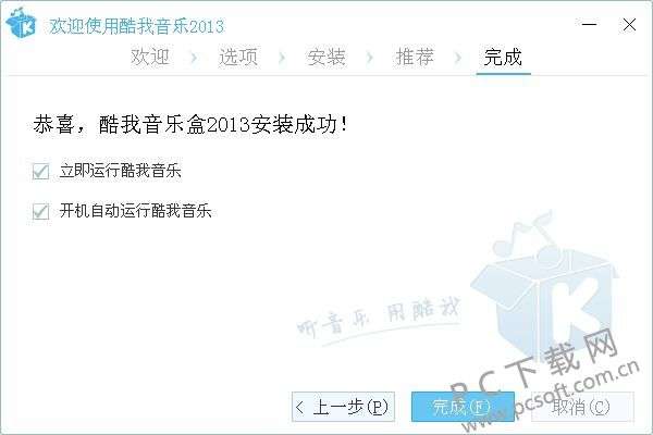 5、酷我音乐2013安装成功,如下图所示,用户已经在电脑上安装了这款软件,在界面中间还有两个选项,立即运行和开机自启,用户可以根据自己的需要选择勾选或者取消勾选,选择完成后点击右下角的完成就可以关闭安装界面打开酷我音乐2013开始使用了。