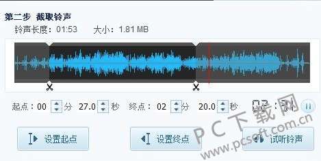 5、将歌曲导入进来后,如下图所示,然后我们进行第二步截取铃声选项,可以看到有铃声长度、大小等信息,我们开始进行铃声的剪辑工作。